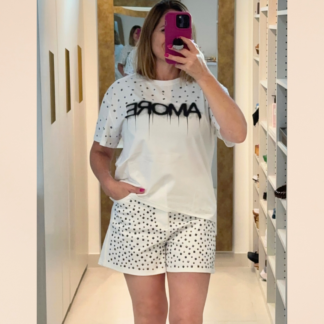 Top and shorts (Denim stretch) material. Metal studs detail. Low waist pockets shorts. Runs true to size.