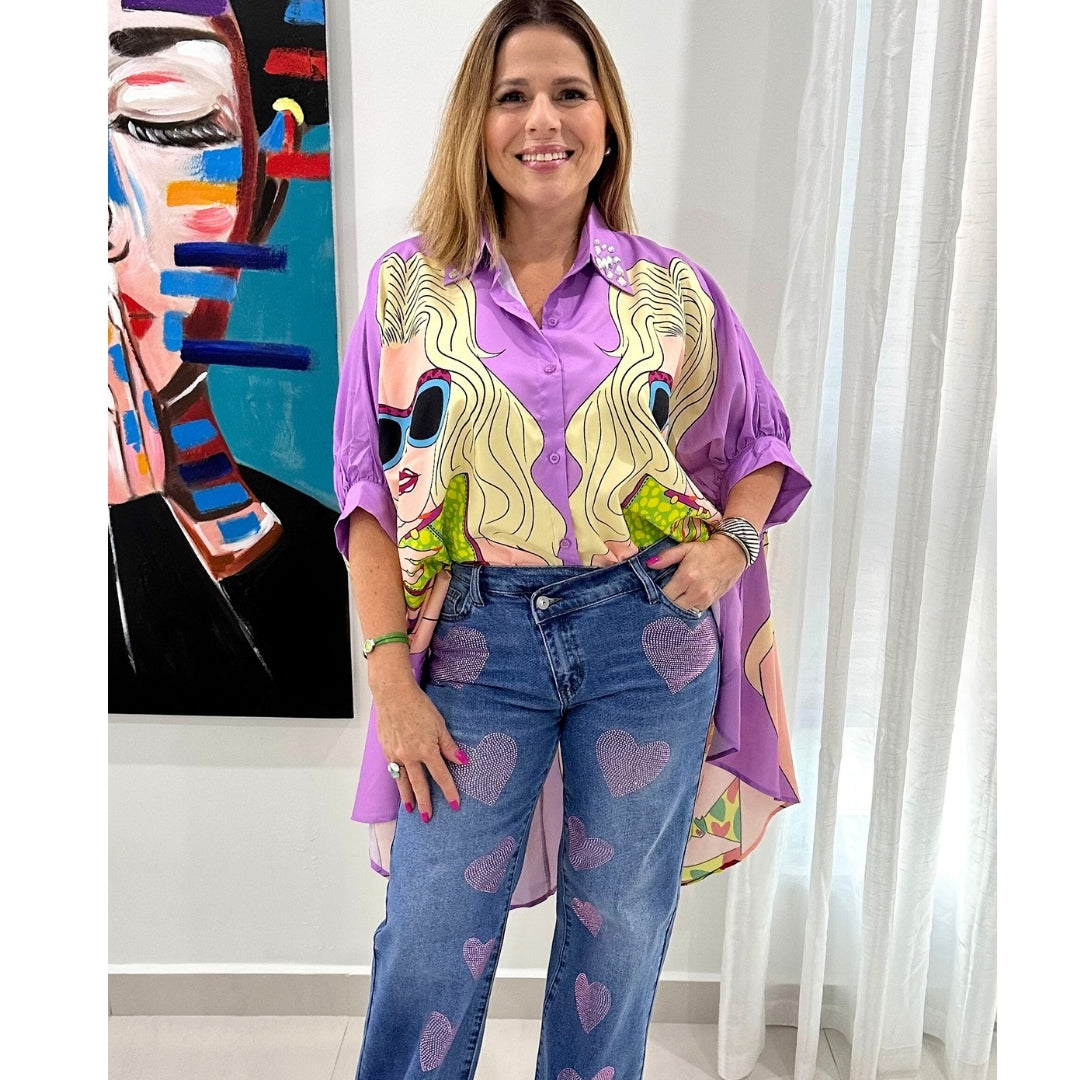 Vibrant M.i.U. Jeans!!! It's lovely. A pair of low-rise wide jeans featuring heart shape rhinestone embellishment, crossed waist and a zip fly closure. Fabric: 99% Cotton, 1% Spandex