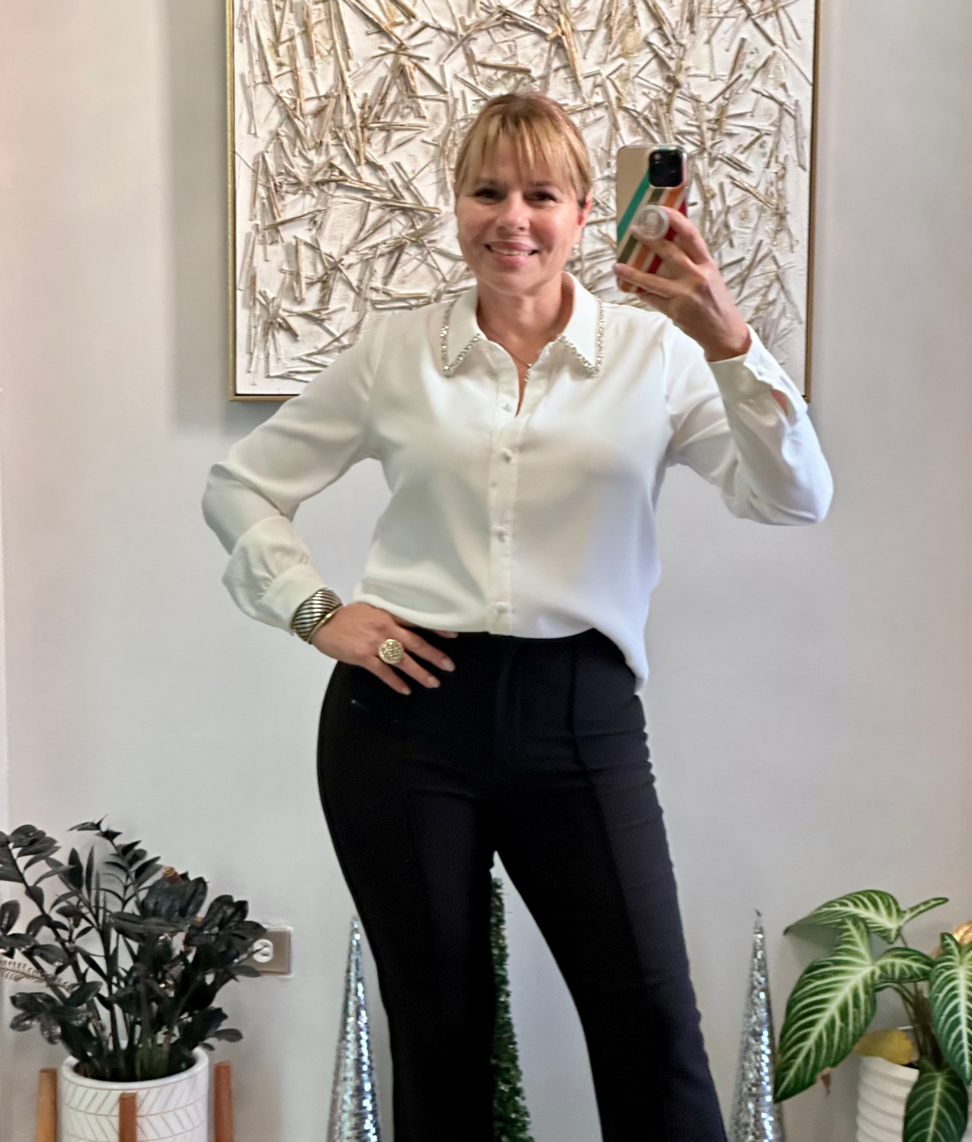 Elegant white blouse with buttons on the front and rhinestone on the neck. Runs true to size. Fabric: 95% poly and 5% spandex.